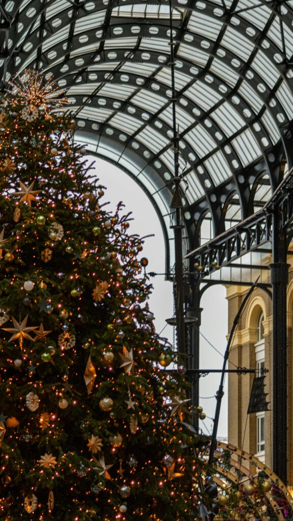 Covent Garden ist der Inbegriff von Weihnachtsromantik: Ein riesiger Weihnachtsbaum, glitzernde Riesen-Ornamente unter den Glasdächern und Straßenkünstler, die für Stimmung sorgen. Hier trifft festliche Eleganz auf urbanes Flair.